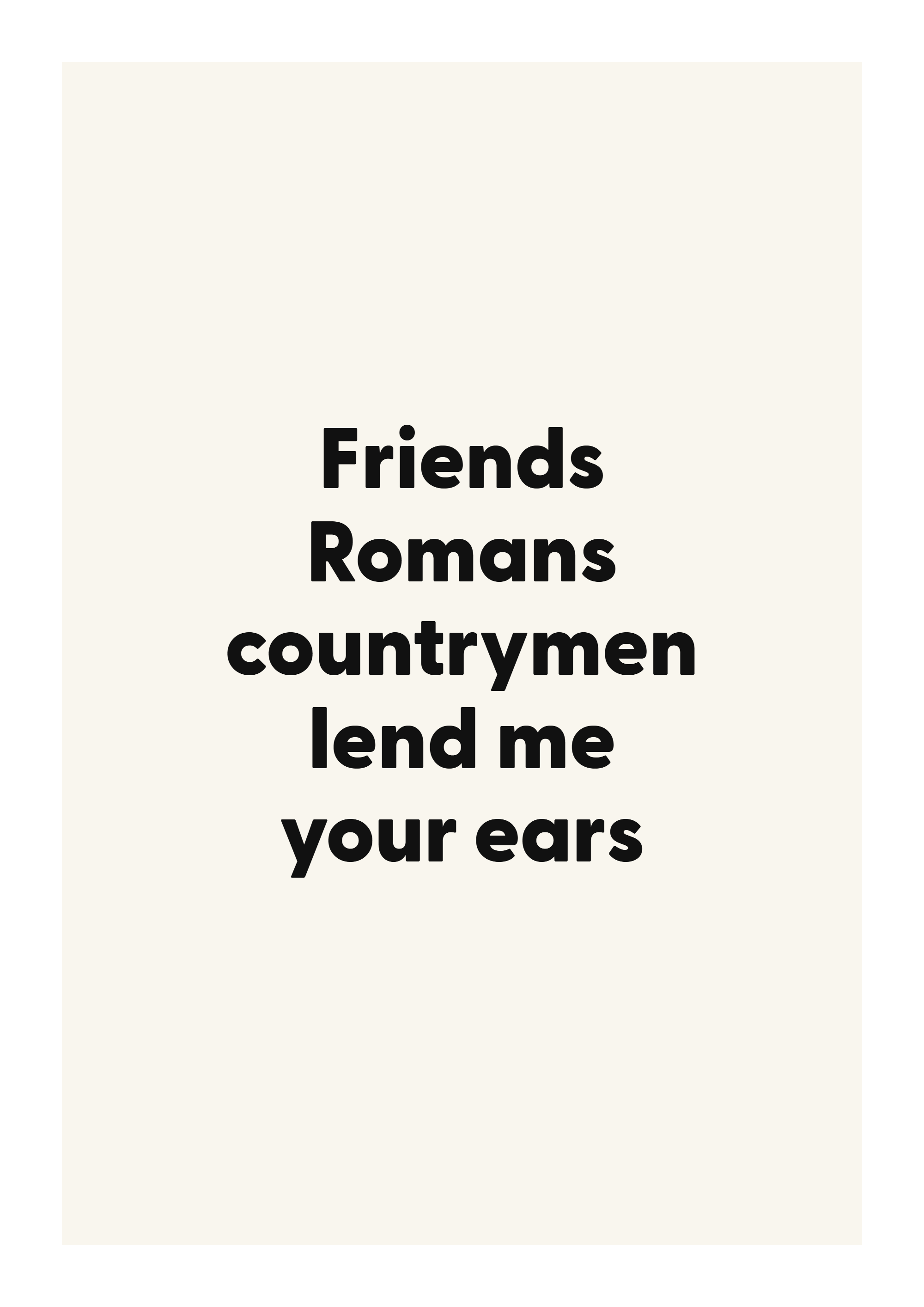 Celebrate timeless writing with this literary quote poster, designed for readers and thoughtful interiors. Featuring the words “Friends Romans countrymen lend me your ears”, this design is made to feel personal without overwhelming the room.
