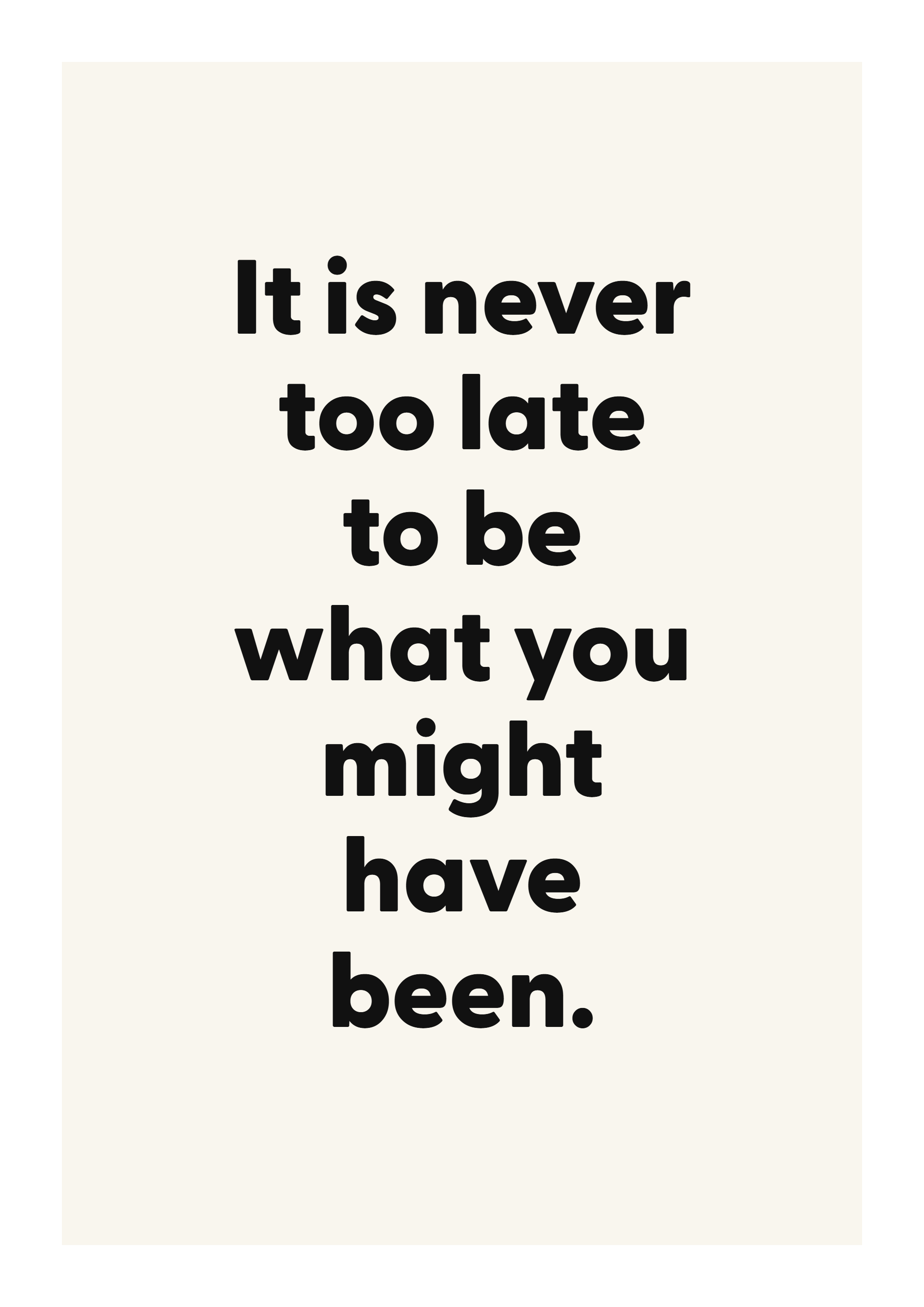 Add a daily reminder of perspective and momentum with this motivational quote poster. Featuring the words “It is never too late to be what you might have been.”, this design is made to feel personal without overwhelming the room.