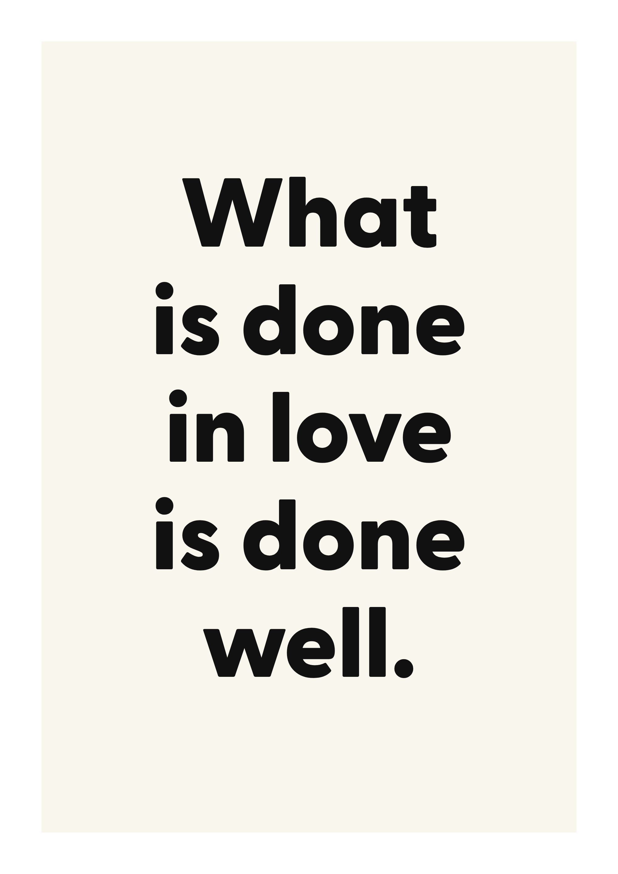 Bring warmth and connection to your walls with this romantic quote poster. Featuring the words “What is done in love is done well.”, this design is made to feel personal without overwhelming the room.